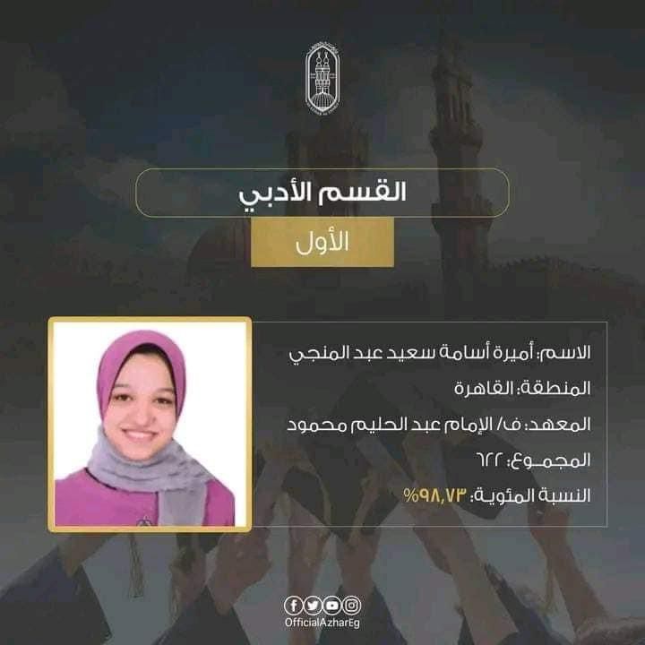 حصلت أميرة أسامة سعيد عبد المنجي، الطالبة بمعهد فتيات الإمام عبد الحليم محمود بمنطقة القاهرة الأزهرية، على المركز الأول على القسم الأدبي بمجموع (٦٢٢) درجة بنسبة (٩٨