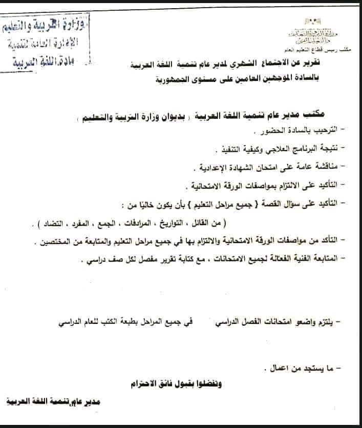 وأكدت وزارة التربية والتعليم والتعليم الفني، في خطابها المرسل للمديريات التعليمية، أن تكون الأسئلة بمادة اللغة العربية بامتحانات الفصل الدراسي الأول خالية من «من القائل؟ - التواريخ - المرادفات - الجمع- المفرد - التضاد»، مع ضرورة المتابعة الفنية لجميع الامتحانات، مع كتابة تقرير مفصل لكل صف دراسي.
