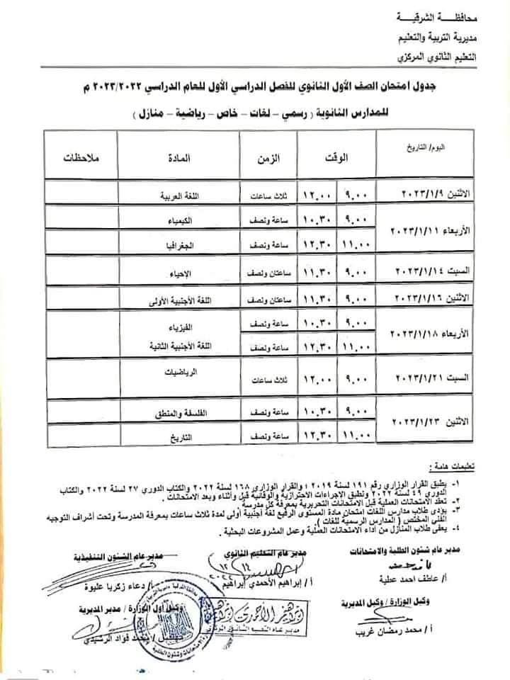 أعلنت إدارة التعليم الثانوي المركزي بمديرية التربية والتعليم والتعليم الفني بمحافظة الشرقية جدول امتحانات الصف الأول والثاني الثانوي للفصل الدراسي الأول للعام الدراسي 2022-2023 للمدارس الثانوية رسمي ولغات وخاص ورياضية ومنازل.