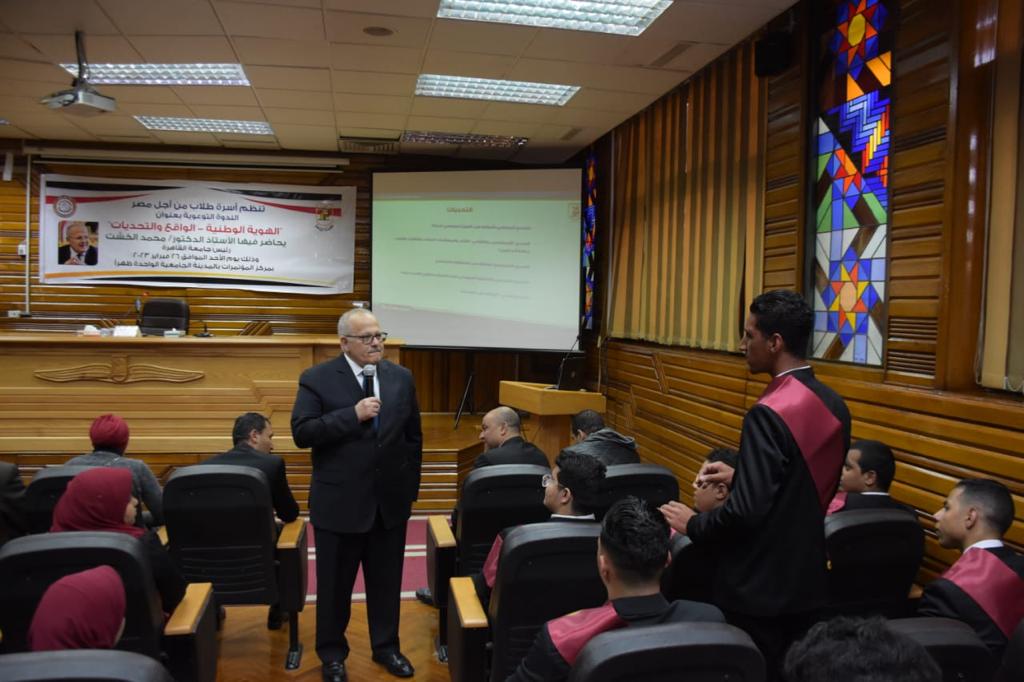 حاضر الدكتور محمد عثمان الخشت رئيس جامعة القاهرة، في ندوة توعوية بعنوان "الهوية الوطنية المصرية .. الواقع والتحديات"، والتي نظمتها أسرة طلاب "من أجل مصر" بقاعة المؤتمرات بالمدينة الجامعية، وذلك بحضور الدكتور جمال الشاذلي نائب رئيس الجامعة لشؤون التعليم والطلاب، والدكتورة جيهان المنياوي منسق عام أسرة من أجل مصر بجامعة القاهرة.