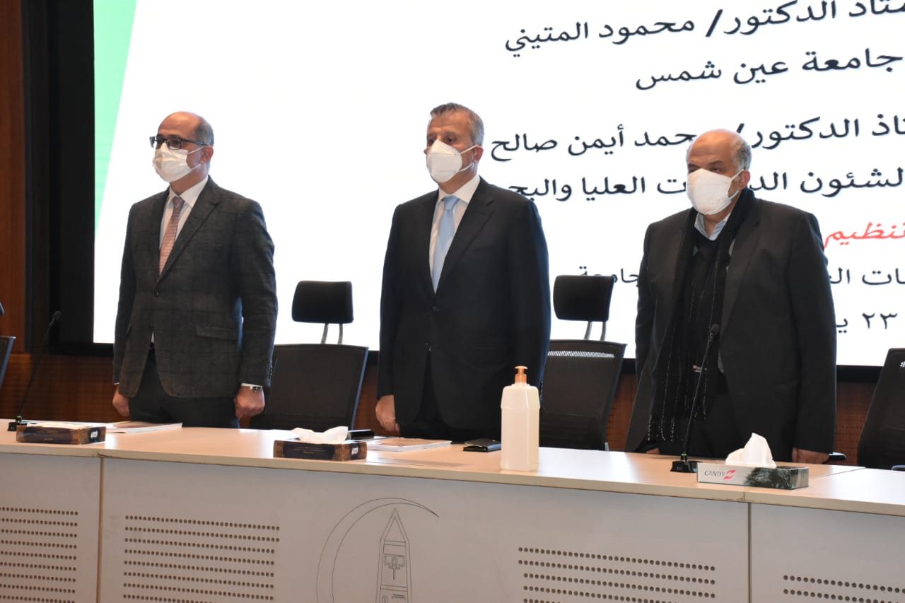وفي كلمته اعرب ا.د. محمود المتيني رئيس جامعة عين شمس عن سعادته بتضاعف عدد الباحثين والأبحاث خلال الفترة الماضية من حيث الكم والجودة مشيرا ان الجامعة تتطلع إلى المزيد دوما بالإضافة إلى الاهتمام بالابحاث البينية،وأكد سيادته ضرورة تضافر جهود الأقسام المتشابهة في الكليات المختلفة - الدوائر العلمية - مما يعضد الجهود المبذولة للوصول الي نتائج أفضل.