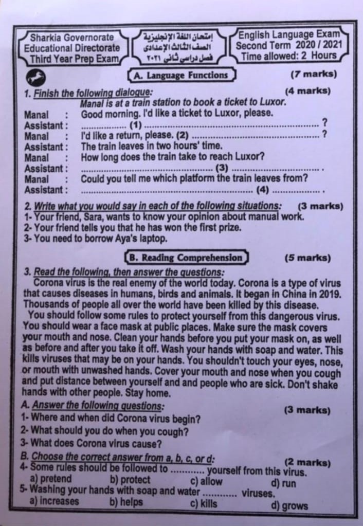 وترصد منصة امتحانات مصر من خلال السطور التالية أبرز و أهم الأسئلة الخاصة بمادة اللغة الإنجليزية لطلاب الصف الثالث الإعدادي.