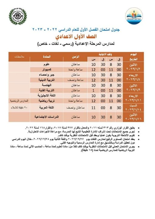 ثالثاً / الصف الأول الإعدادي تبدأ خلال الفترة من 2 إلى 16 يناير 2023